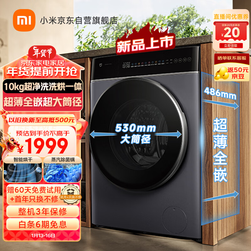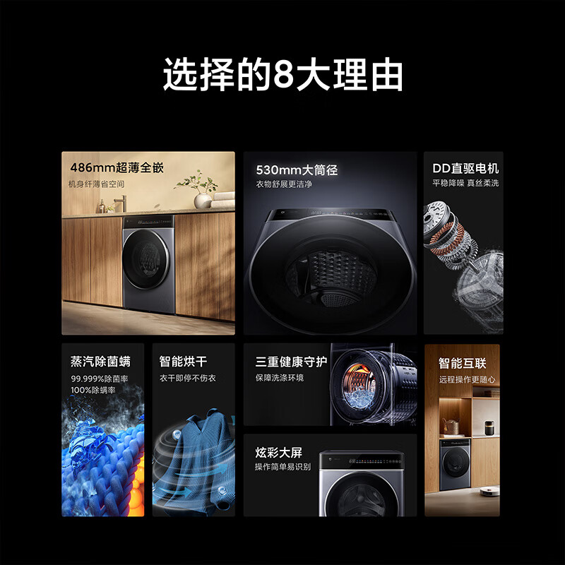 米家小米10公斤超净洗pro滚筒全自动洗烘一体洗衣机 530mm超大筒径超薄机身1.1高洗净比XHQG100MJ301价格:1999.00元!