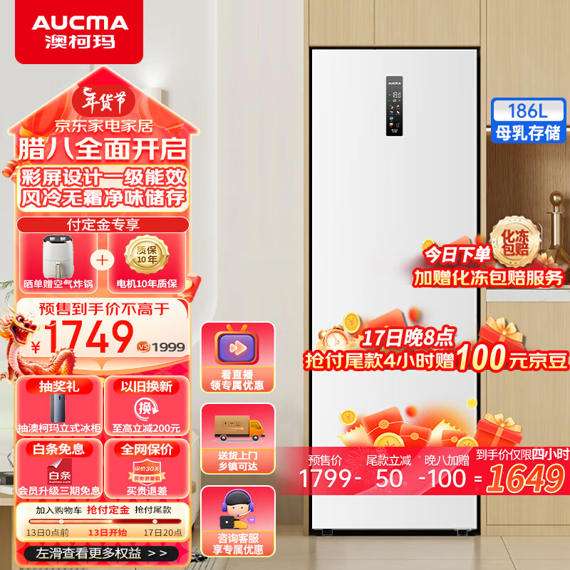 澳柯玛(AUCMA)186升立式冰柜家用双变频风冷无霜 冻藏两用抽屉式冰柜 母乳小冷柜 以旧换新 星辉白 BD-186WPHNXI价格:1749.00元!