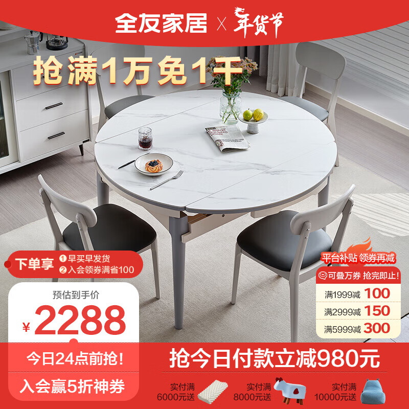 全友家居 餐桌现代简约岩板餐桌椅可圆可方折叠款餐厅吃饭桌子DW1028K价格:3268.57元!