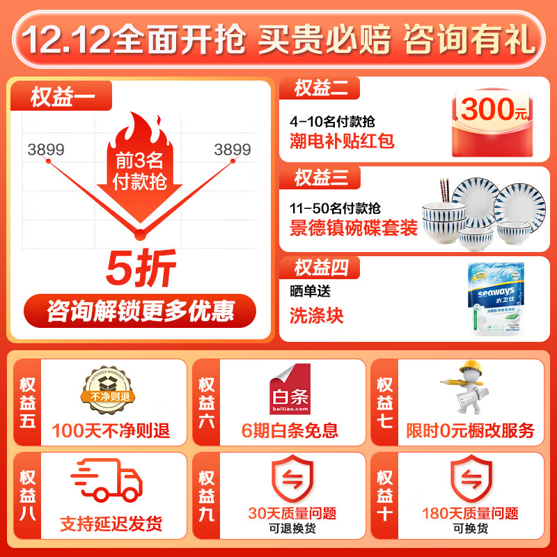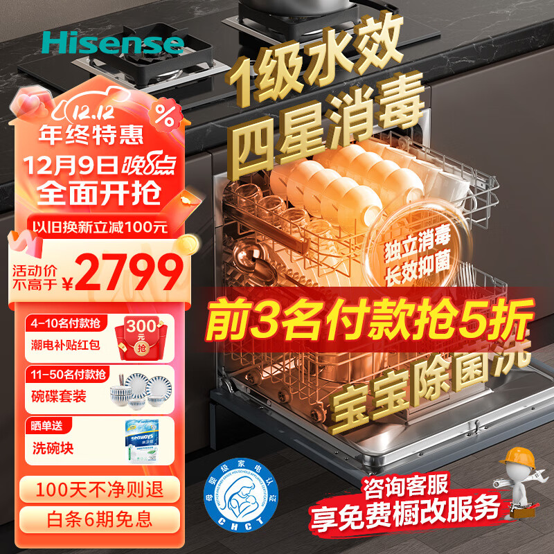 海信(Hisense)洗碗机嵌入式12套灶下大容量 一级水效 四星消毒 长效存储72H 热风烘干 全钢内胆WQ8-C310价格:2899.00元!