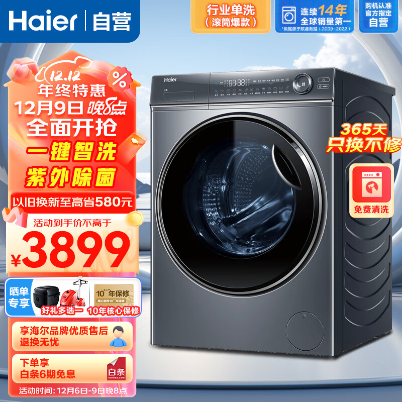 海尔(Haier)滚筒洗衣机全自动 9公斤 直驱变频525大筒径超薄平嵌一键智洗特渍洗376价格:3899.00元!