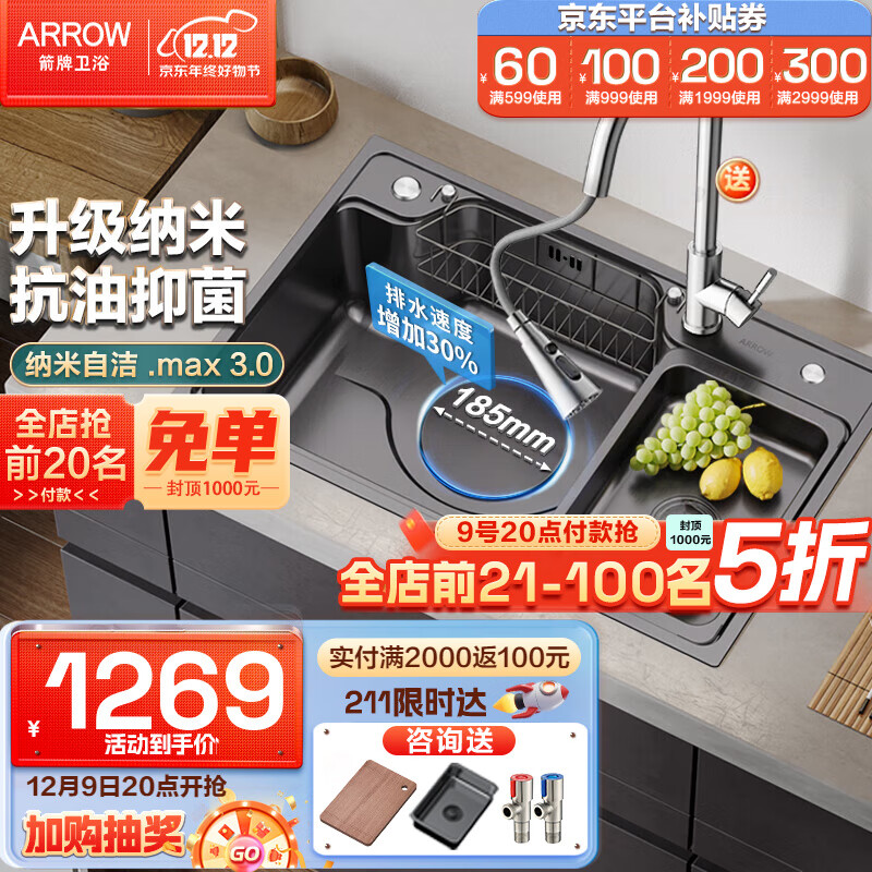 箭牌(ARROW)304不锈钢日式水槽大单槽洗菜盆纳米台上台中台下洗碗池 75*48纳米单槽-冷热银色抽拉龙头价格:1619.00元!
