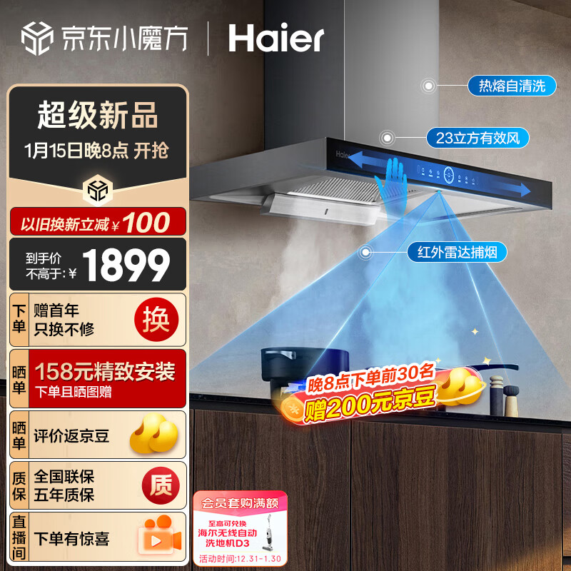 海尔(Haier)抽油烟机 顶吸欧式油烟机 23m3/min有效风 挥手智控 热熔洗自动清洗 以旧换新 家用排烟机ET931价格:1899.00元!