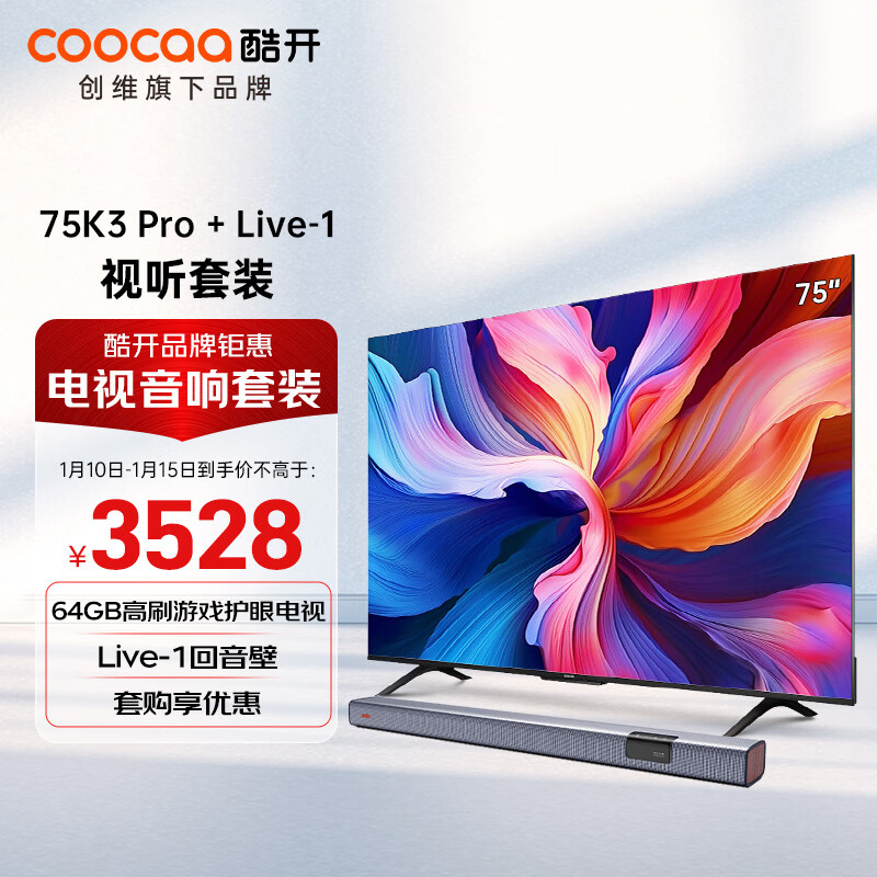 酷开创维 75英寸K3 Pro电视机+音响Live-1 回音壁 客厅家庭影院 壁挂条形音箱 蓝牙影院级娱乐体验套装价格:3528.00元!