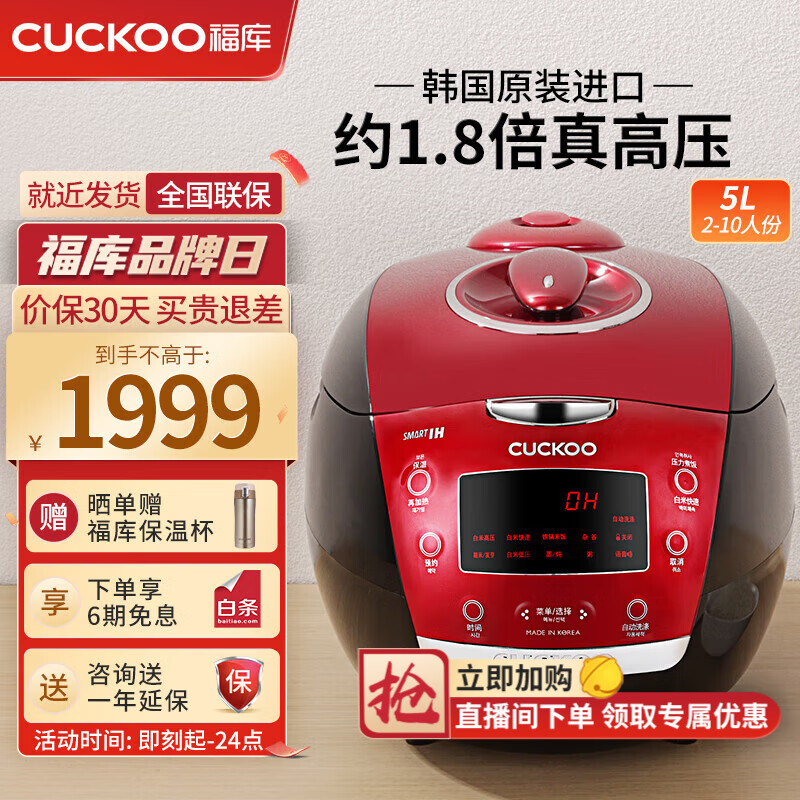 福库(CUCKOO)柴火饭电饭煲家用5-8个人韩国原装进口5升大容量电饭锅IH电磁加热预约语音高压多功能打铁名匠内胆 CRP-HU1058SK/H(5L 2-10人份)价格:2599.00元!