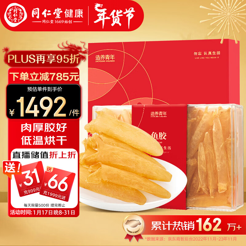 北京同仁堂【年货礼品】造养青年 鱼胶300克(80-90头/500克) 干花胶 黄花鱼胶 孕妇滋补品 送礼盒价格:2277.00元!