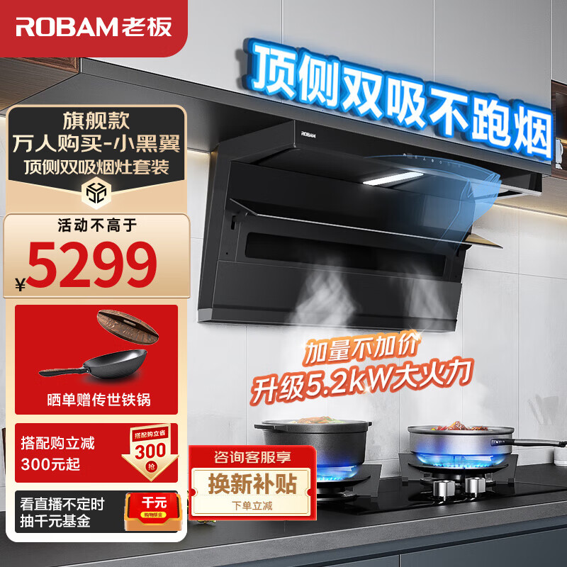 老板(Robam)油烟机27A13-D1【老板小黑翼】顶侧双吸抽油烟机25风量1000Pa超大吸力静压七字型挥手智控吸油烟机 【旗舰款-万人购买】D1+57B0X 小黑翼价格:5299.00元!