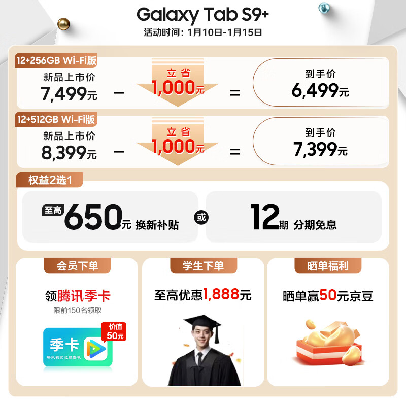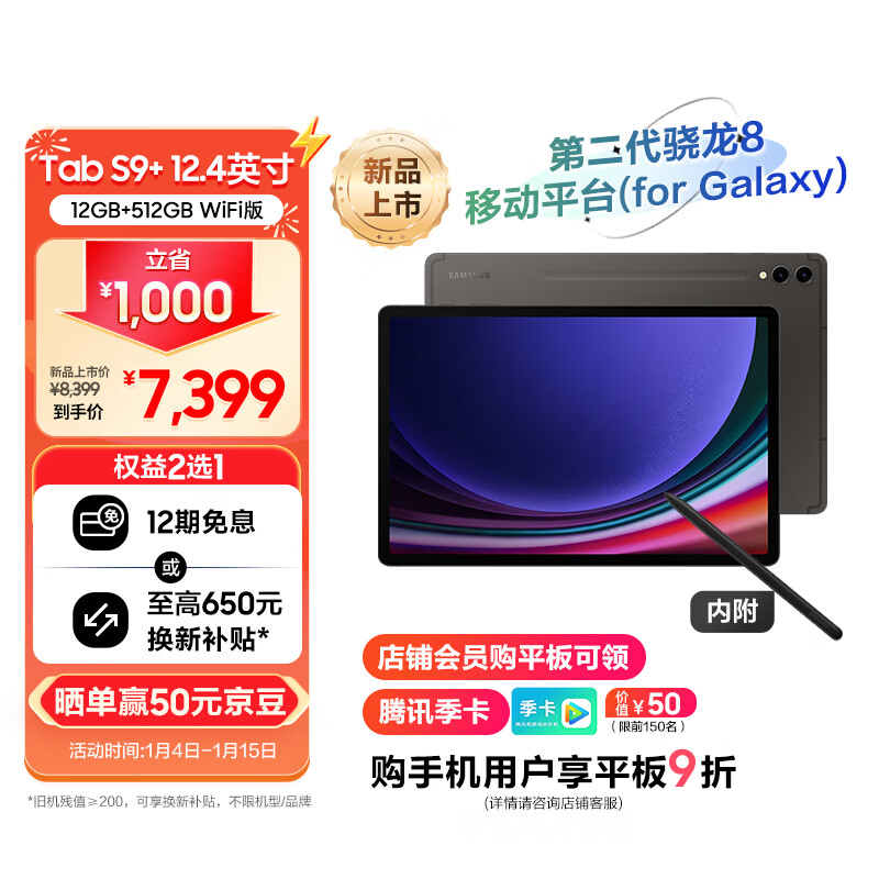 三星(SAMSUNG)平板电脑2023款Tab S9+ 12.4英寸 12G+512G WIFI 骁龙8Gen2 全视屏 内附Spen 云影灰价格:7399.00元!