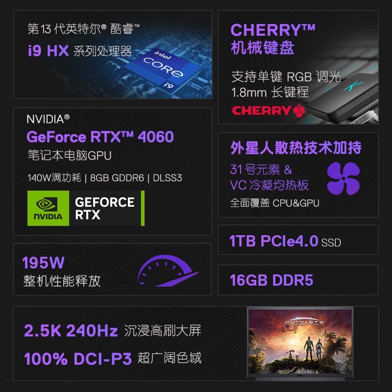 戴尔(DELL)游匣G16 2.5K 16英寸游戏本 笔记本电脑(13代i9HX 16G DDR5 1TB RTX4060 240Hz CHERRY键盘 外星人散热)价格:11999.00元!
