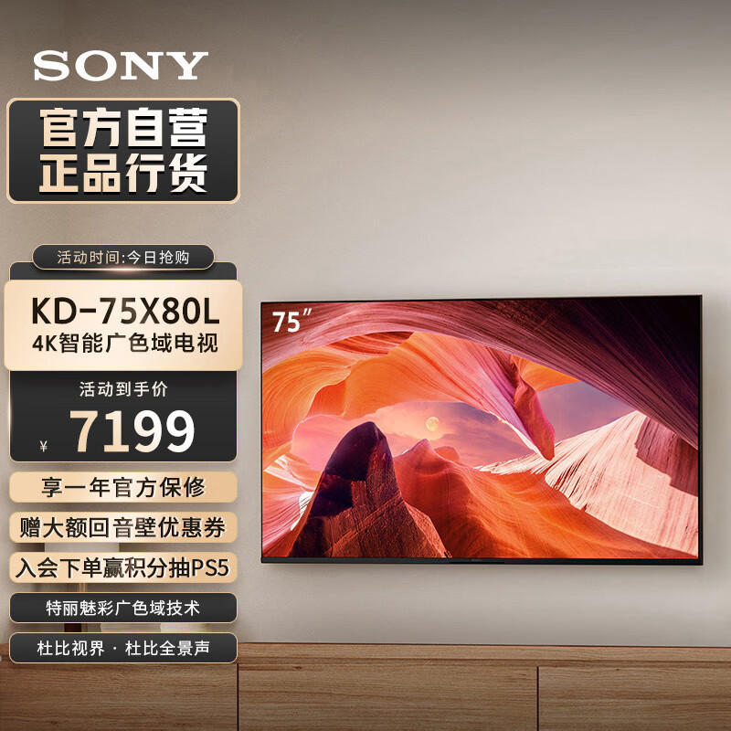 索尼(SONY)【官方直营】KD-75X80L 75英寸 屏 4K超高清HDR 安卓智能电视 X1芯片 特丽魅彩Pro 京配上门价格:7199.00元!