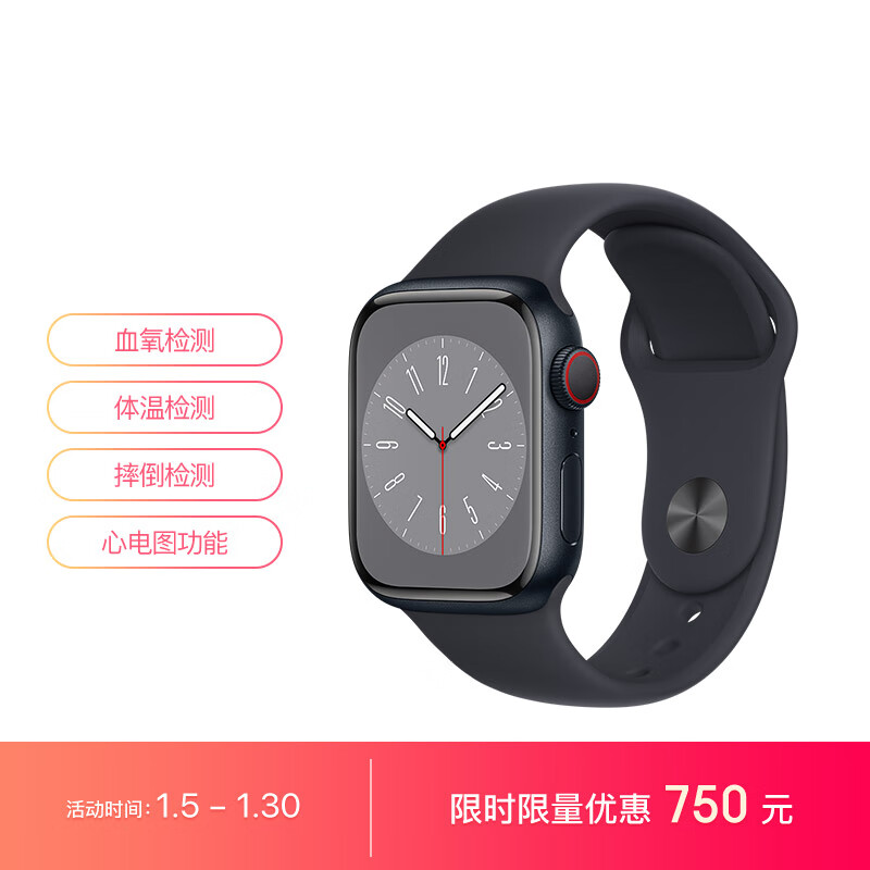 Apple/苹果 Watch Series 8 智能手表GPS+蜂窝款41毫米午夜色铝金属表壳午夜色运动型表带eSIM手表 S8 MNHW3CH/A价格:3049.00元!