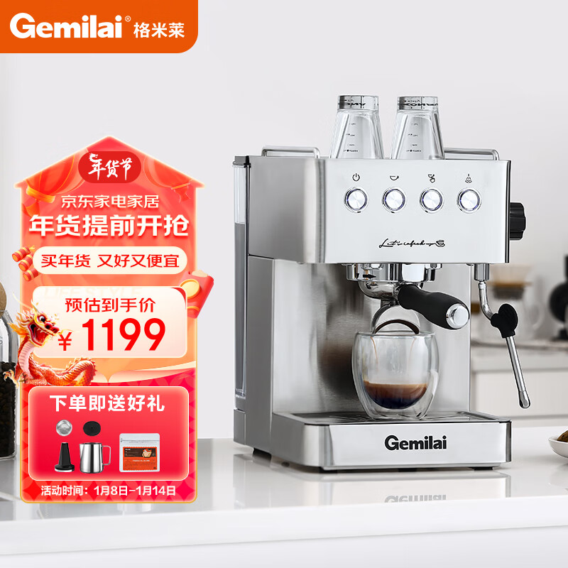 格米莱(GEMILAI)咖啡机 小型家用全半自动 意式浓缩泵压式萃取 蒸汽打奶泡 CRM3005E 不锈钢银色价格:1199.00元!