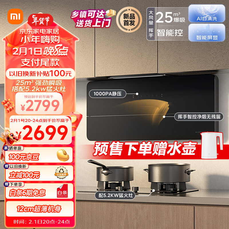 米家小米抽油烟机超薄近吸家用侧吸 智能变频厨房大吸力25风量挥手智控5.2kW烟灶互联套装CXW-120-MJ07价格:2799.00元!