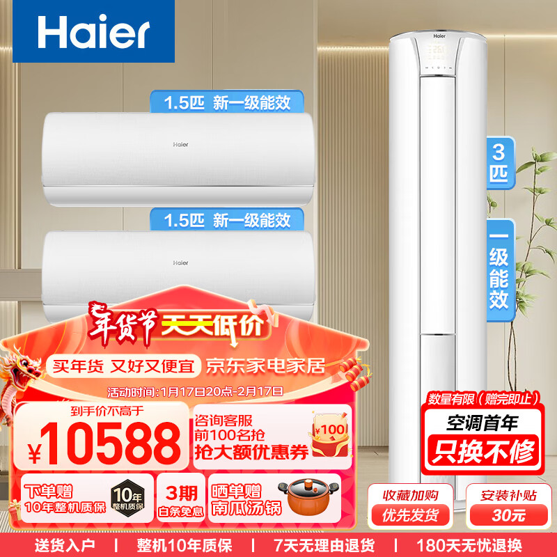 海尔(Haier)空调套装两室一厅新一级能效变频空调家用APP智控自清洁(1.5匹挂机*2+3匹立式柜机) 以旧换新价格:10588.00元!