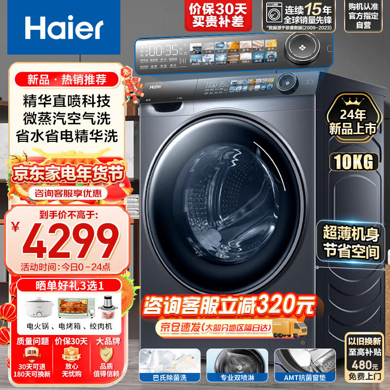 海尔洗衣机全自动滚筒 彩晶屏精华洗10kg超薄平嵌洗烘一体双喷淋设计 智能投放 1.1高洗净比以旧换新价格:4299.00元!