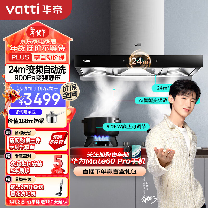 华帝(VATTI)抽油烟机家用顶侧欧式变频大吸力烟机燃气灶烟灶套装24风量自动清洗吸油烟机灶具套装i11206天然气价格:3499.00元!