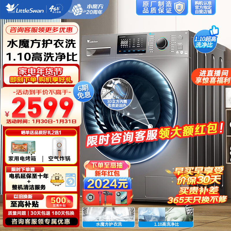 小天鹅(LittleSwan)洗衣机全自动 10公斤滚筒水魔方洗衣机冷水洗防缠绕一级能效 以旧换新TG100V868WMADY价格:2599.00元!