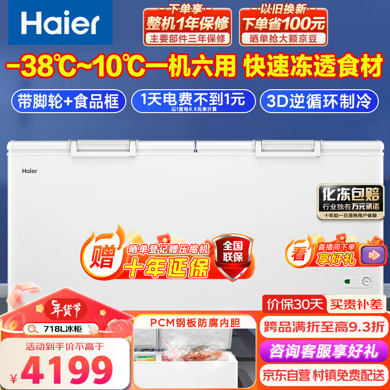 海尔(Haier)718升卧式商用家用冰柜 商用大容量五面制冷 冷藏柜大冷冻柜冰柜家用冰箱大冷柜BC/BD-718GHPD价格:4349.00元!