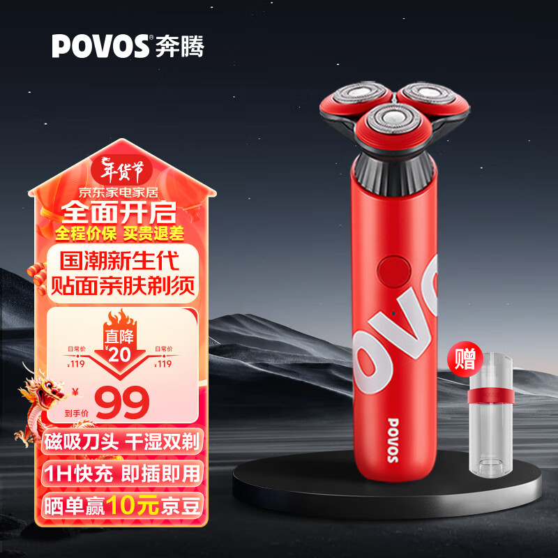 奔腾(POVOS)剃须刀电动刮胡刀胡须刀全身水洗快充PQ9700珊瑚红送男友送老公生日新年礼物价格:103.00元!