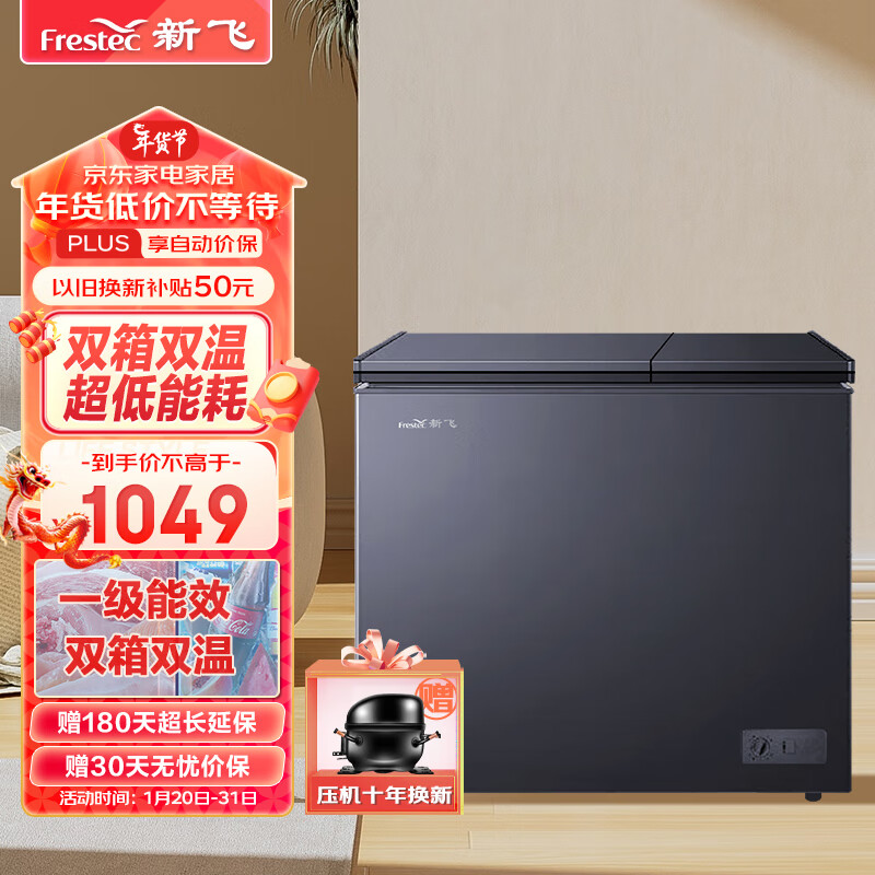 新飞(Frestec)220升家用商用冰柜一级能效双箱双温冷柜顶开门冷冻卧式冰箱(青釉蓝)BCD-220KAT/L价格:1049.00元!