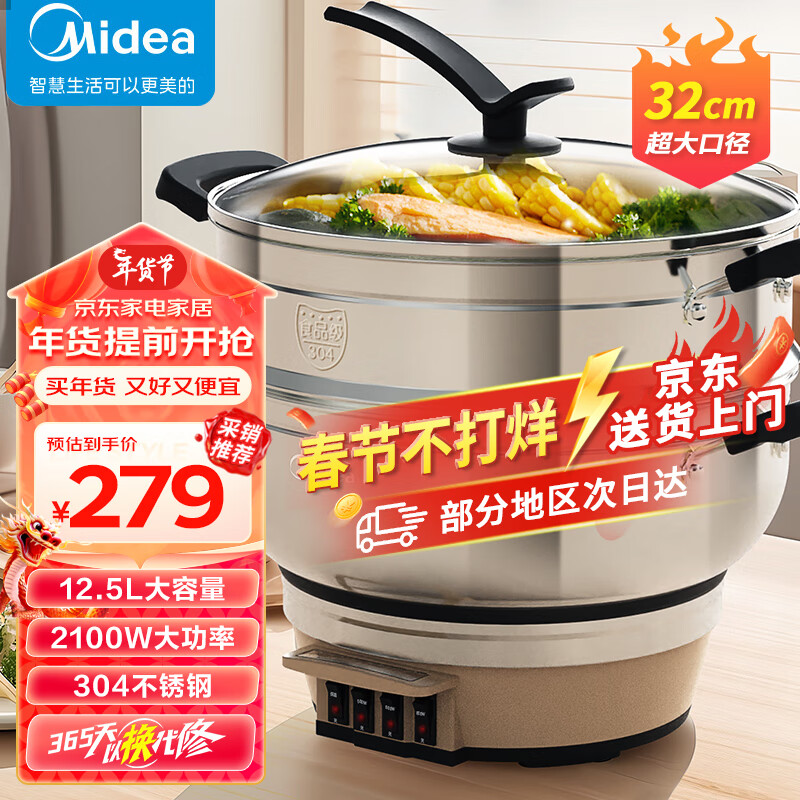 美的(Midea)多用途锅 电蒸锅 多功能锅蒸包子锅电锅 加厚304不锈钢电炒锅电煮锅 电火锅 12.5L MZ-ZGC32J50价格:279.00元!