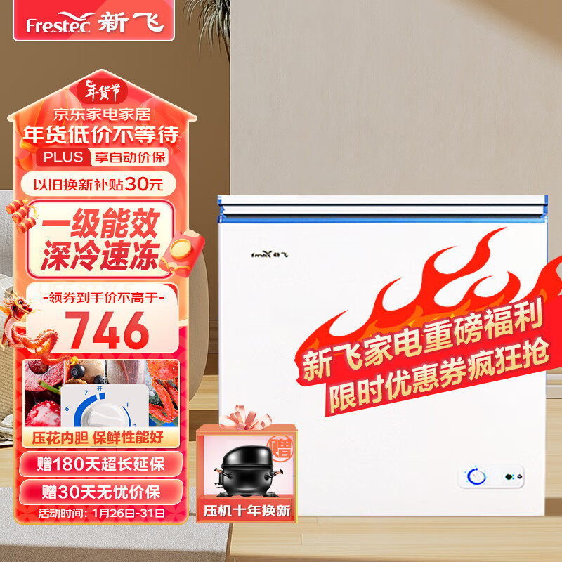 新飞(Frestec)201升冷藏冷冻转换一级能效家用商用变温冷柜卧式冰箱冰柜(白色)BC/BD-201KHAT价格:746.00元!