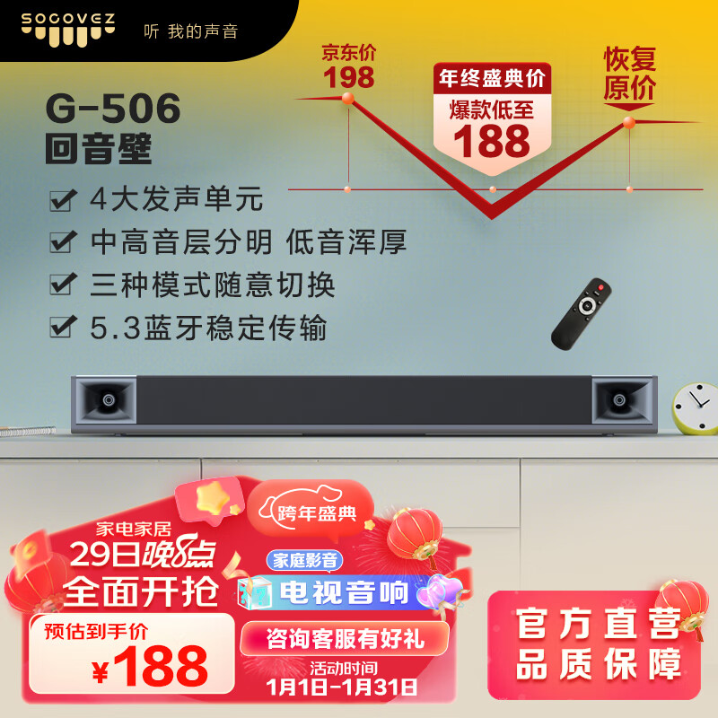 思承(SOCOVEZ) G-506 回音壁电视音响 家庭影院蓝牙立体声音箱(单支)价格:178.20元!