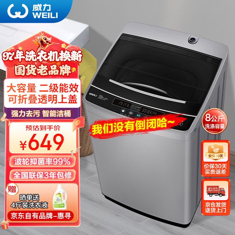 威力(WEILI)8公斤 波轮洗衣机全自动大容量 13分钟快洗 10档水位 护衣内筒防锈箱体 以旧换新XQB80-1999价格:649.00元!