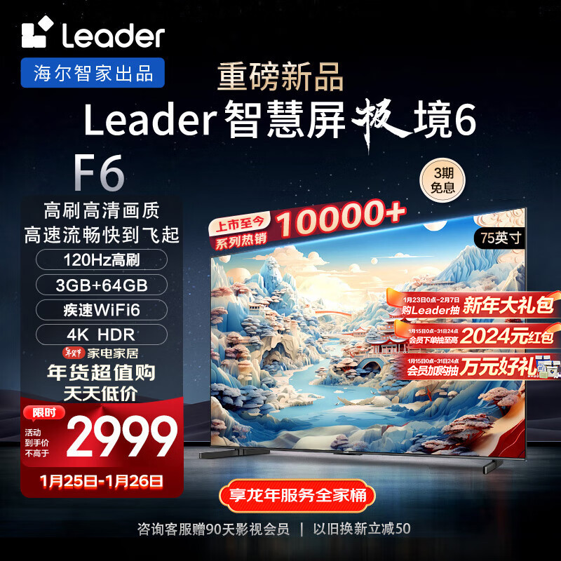 Leader海尔智家出品L75F6 75英寸小超跑智慧屏120Hz高刷游戏电视WiFi6护眼3GB+64GB一触投屏排行前十名85价格:2999.00元!