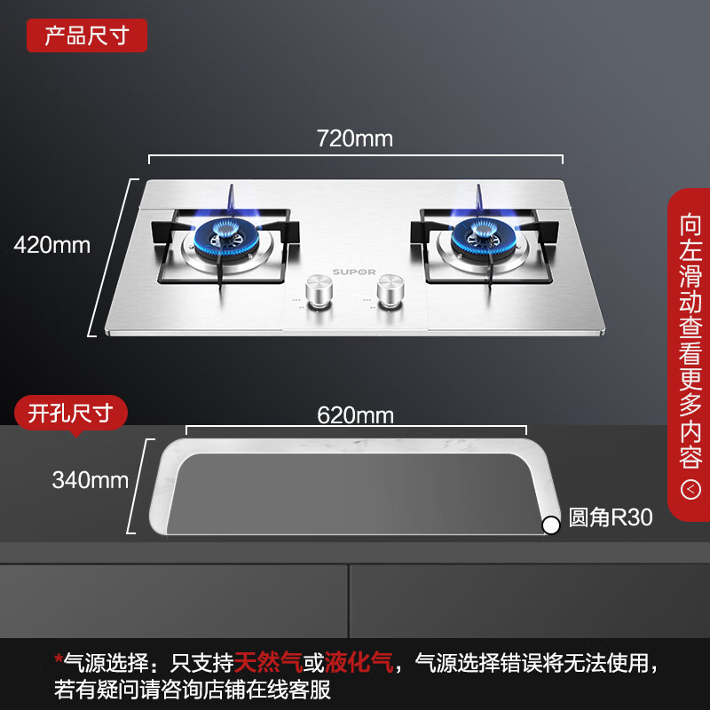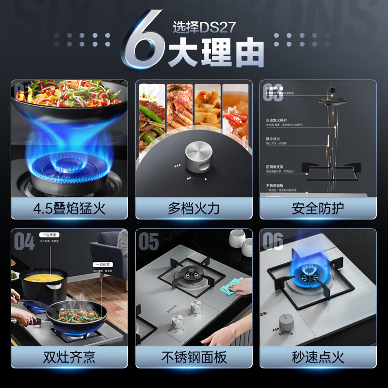 苏泊尔(SUPOR)燃气灶双灶家用 液化气灶双灶具4.5kW火力 不锈钢面板 家用嵌入式台式两用灶台灶具 DS27液价格:399.00元!