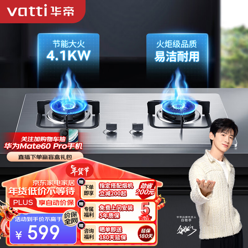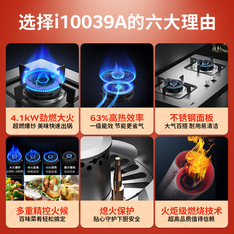 华帝(VATTI)燃气灶家用台式嵌入式两用 4.1kW大火力不锈钢面板煤气灶双灶台灶具JZY-i10039A(液化气)价格:572.00元!