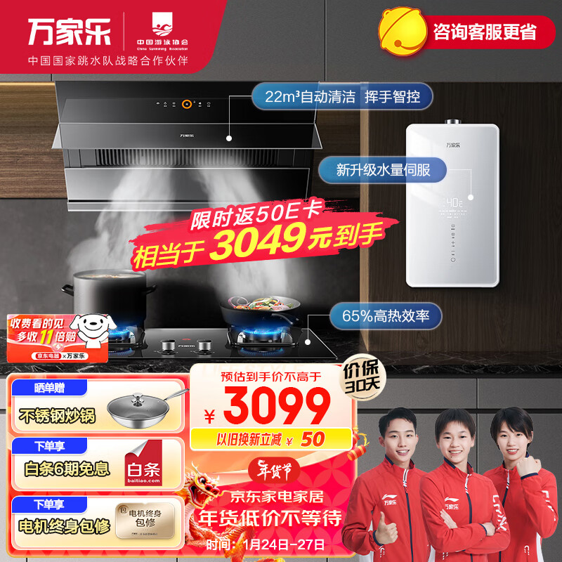 万家乐烟灶热水器三件套 22立方挥手烟灶16L水伺服天燃气热水器厨房套装AL061+KV061B+16T8天然气价格:3299.00元!