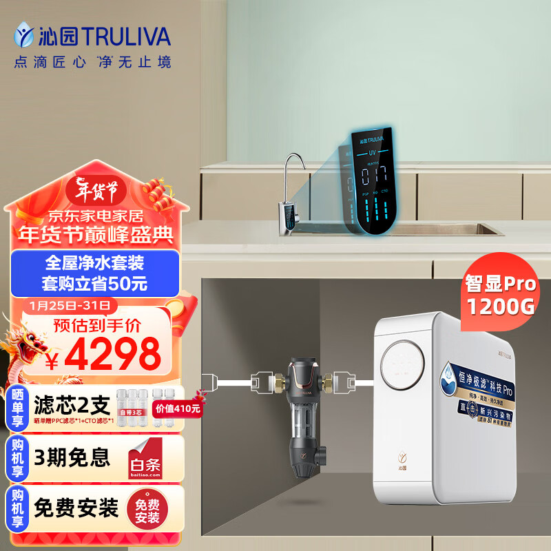 沁园(TRULIVA)小白鲸Pro1200G智能龙头二件套装 净水器UR-S51275+前置过滤器P-A5510(黑)价格:4298.00元!