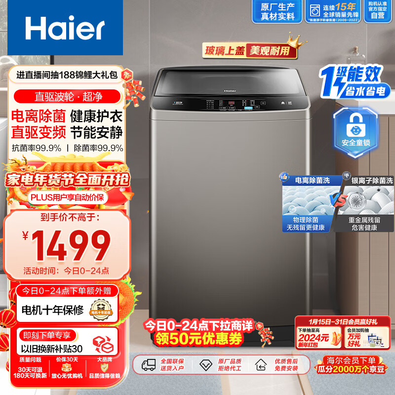 海尔(Haier)波轮洗衣机全自动小型 直驱变频电机 10公斤大容量 电离除菌 羊毛洗 速洗 以旧换新EB100B22Mate2价格:1499.00元!