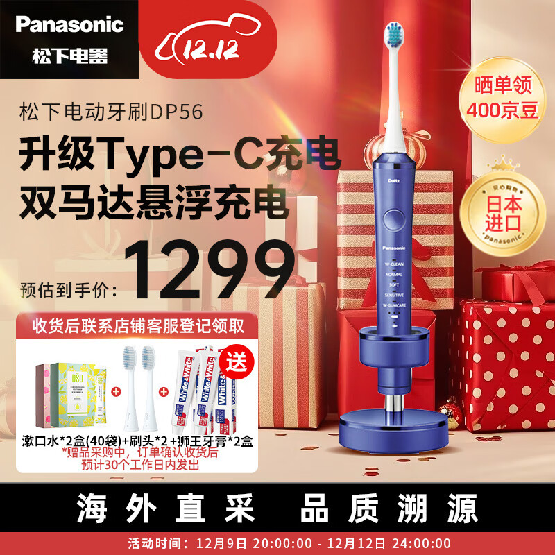 松下(Panasonic) EW-DP56-A 进口电动牙刷 双重声波振动 成人五档刷牙模式 情侣款 蓝色价格:1699.00元!