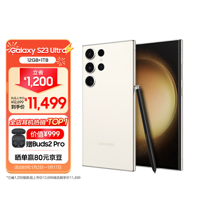 三星 SAMSUNG Galaxy S23 Ultra 2亿像素 第二代骁龙8移动平台 大屏S Pen书写 12GB+1TB 悠柔白 5G游戏手机价格:11499.00元!