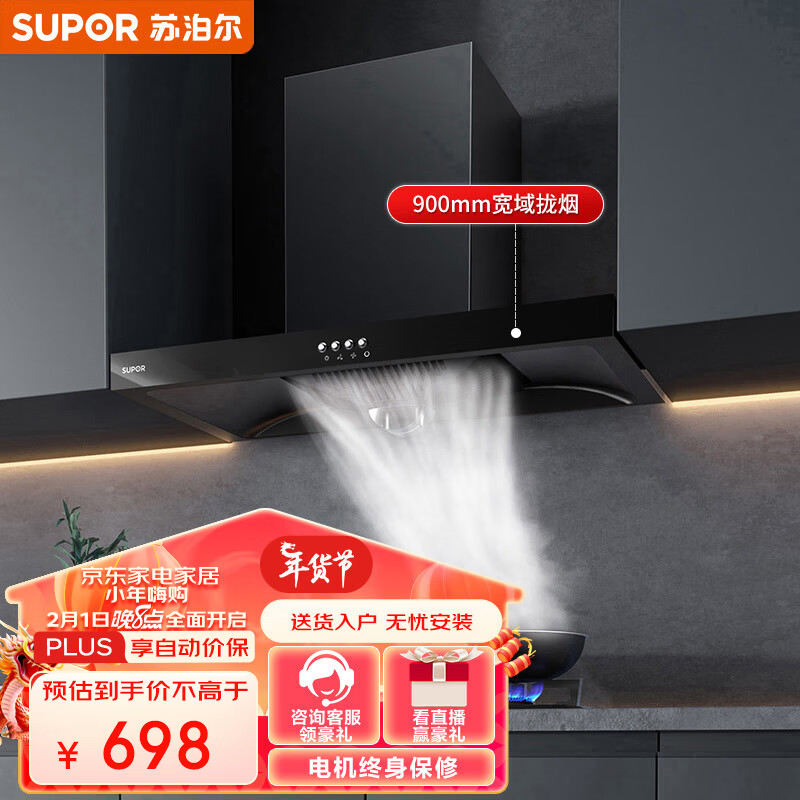 苏泊尔(SUPOR)排油烟机 宽域拢烟大吸力油烟机 家用易清洁欧式顶吸抽油烟机 经典按键操控吸油烟机 DT10价格:698.00元!