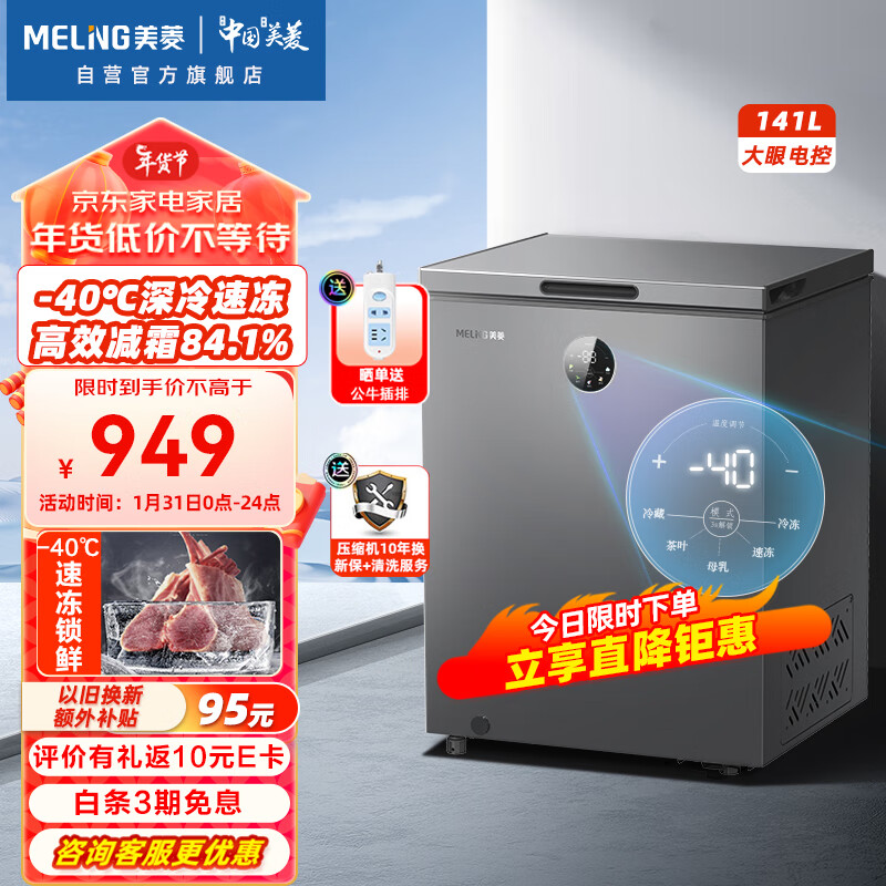 美菱(MELING)141升大眼电控减霜-40℃速冻家用冷藏冷冻转换小冷柜一级节能省电顶开门BC/BD-141DTECX价格:949.00元!