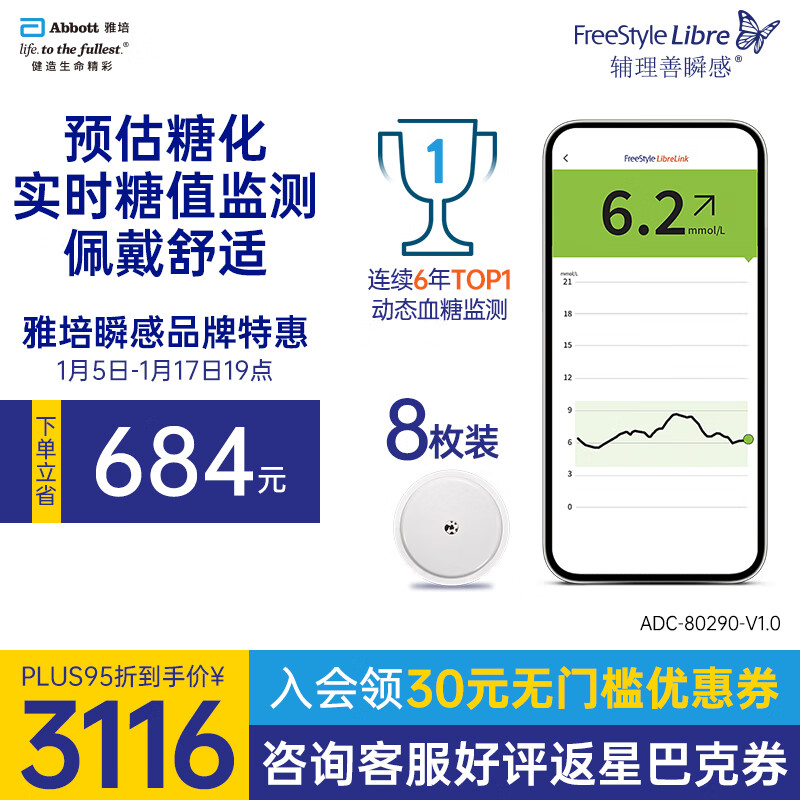 雅培瞬感动态血糖仪家用测血糖监测仪不扎手指测血糖检测仪传感器探头*8枚价格:3800.00元!