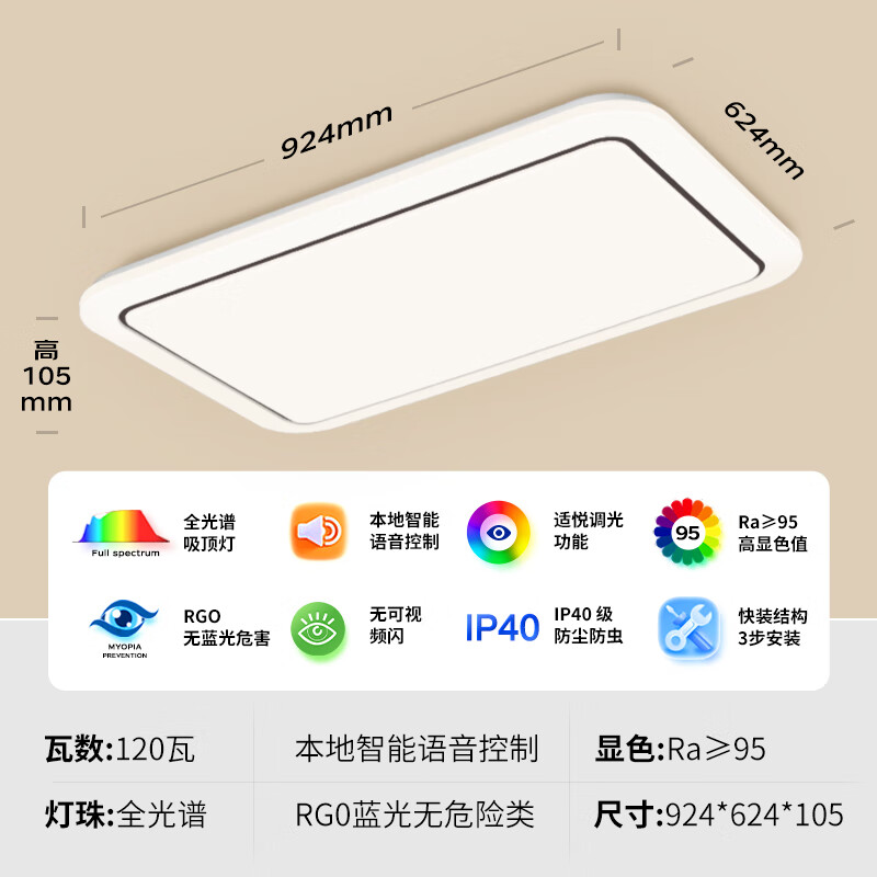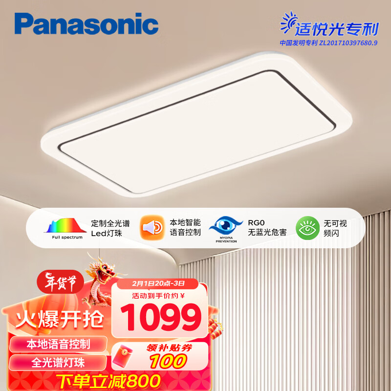 松下(Panasonic)全光谱高显色客厅灯120瓦快装灯防尘防虫本地语音控制调光调色价格:1899.00元!