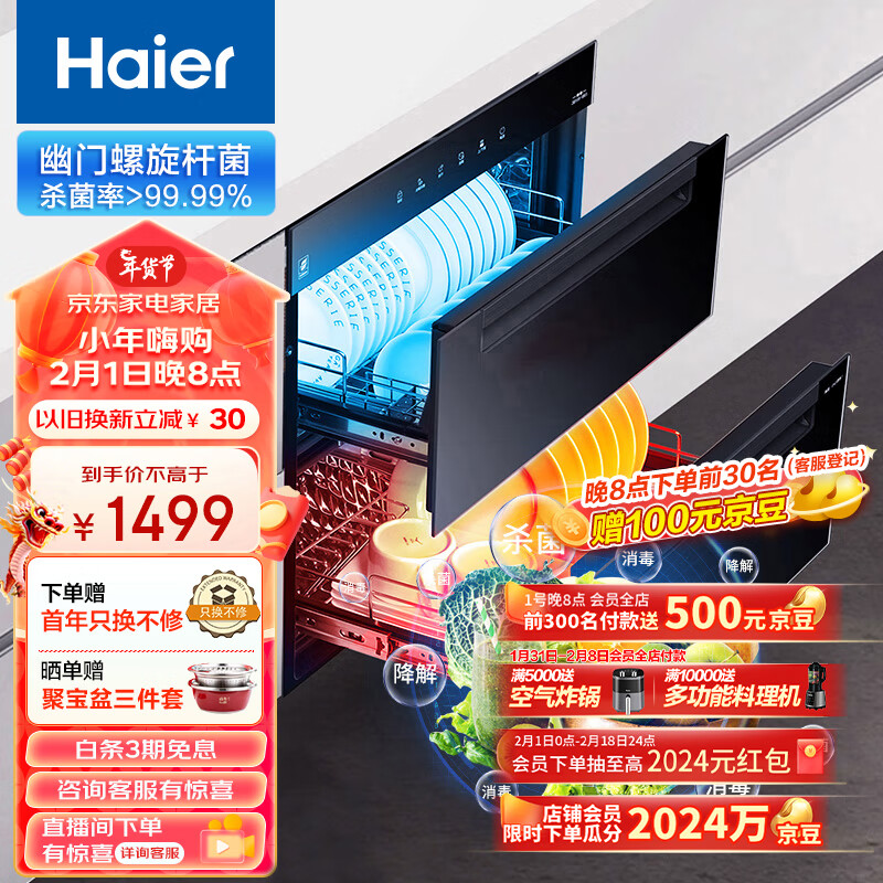 海尔(Haier)消毒柜 家用嵌入式 消毒碗柜 100L上下双层 大容量 光波巴氏消毒 不锈钢 碗柜 母婴童锁EB03价格:1499.00元!