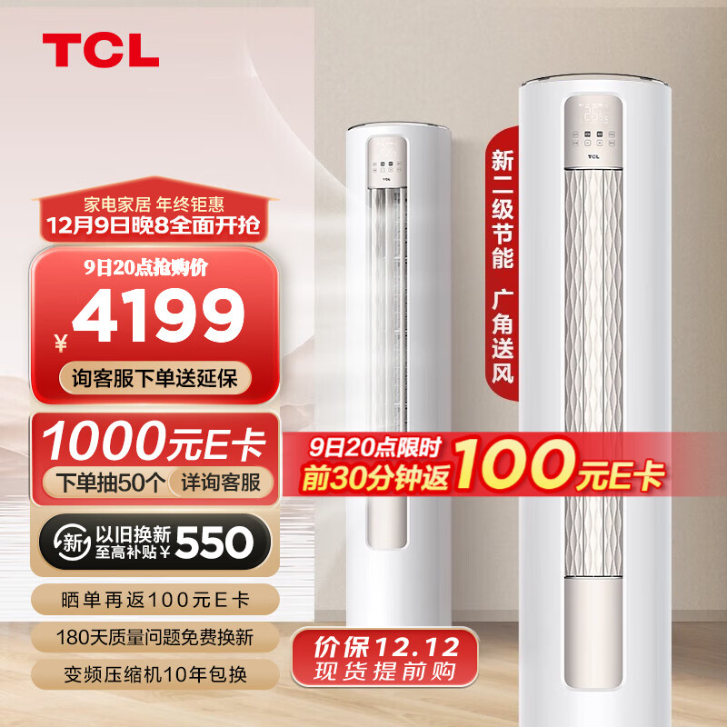 TCL空调 大3匹立柜式 新二级能效 冷暖变频 高温自清洁 低噪大风量 圆柱客厅 立柜机空调 JD以旧换新 KFR-72LW/JV2Ma+B2 新能效空调价格:4169.00元!