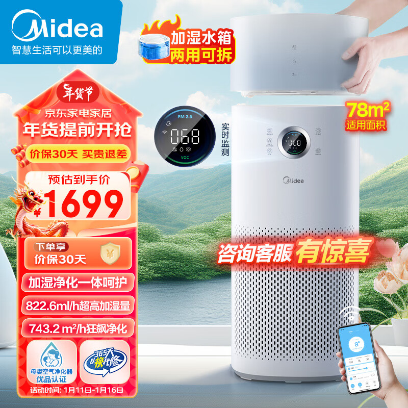 美的(Midea)【星澈空气护理机】空气净化器除甲醛除异味除烟味空气护理加湿净化一体机KJ600G-RX600S价格:2199.00元!