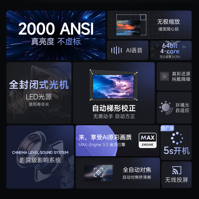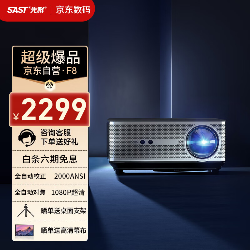 先科F8投影仪家用投影机办公卧室酒店家庭影院(全自动对焦 自动梯形矫正 2000ANSI真流明 全封闭式光机)价格:2299.00元!