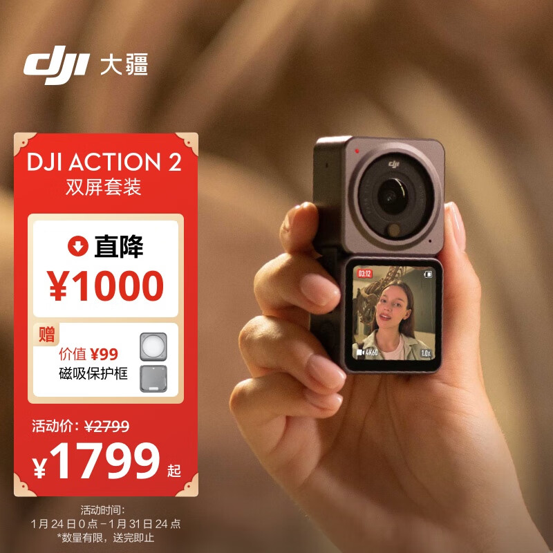 大疆 DJI Action 2 双屏套装 灵眸小型手持防水防抖vlog相机 骑行摄像机便携式 大疆运动相机价格:1799.00元!