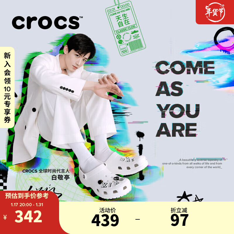 crocs白敬亭同款卡骆驰经典洞洞鞋|10001 白色-100 39(240mm)价格:439.00元!