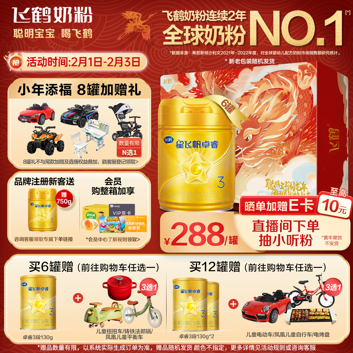 飞鹤星飞帆卓睿经典版 幼儿配方奶粉 3段(12-36月龄)750克*6 乳铁蛋白价格:1963.20元!