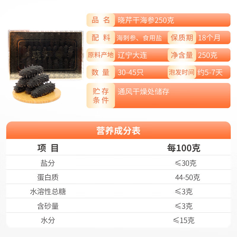 晓芹 大连干海参 250g 30-45只 辽刺参 海参干货价格:2480.00元!