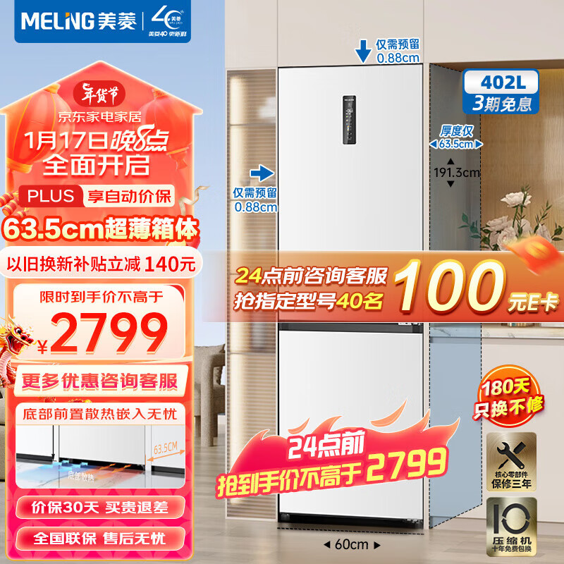美菱(MeiLing)冰箱402升双门两门冰箱一级能效变频风冷无霜超薄嵌入大容量可拼接无缝窄门家用电冰箱 BCD-402WPCZX 雪域白价格:2999.00元!