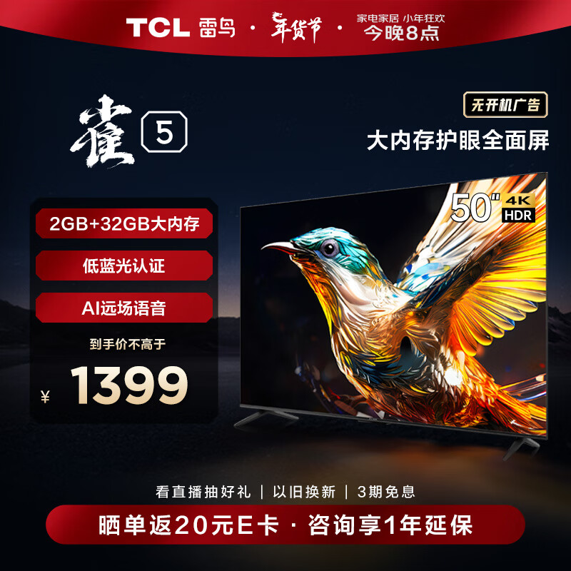 TCL雷鸟 雀5 50英寸电视 4K超高清 护眼防蓝光 超薄屏 2+32GB 游戏智能液晶平板电视机50F275C价格:1399.00元!
